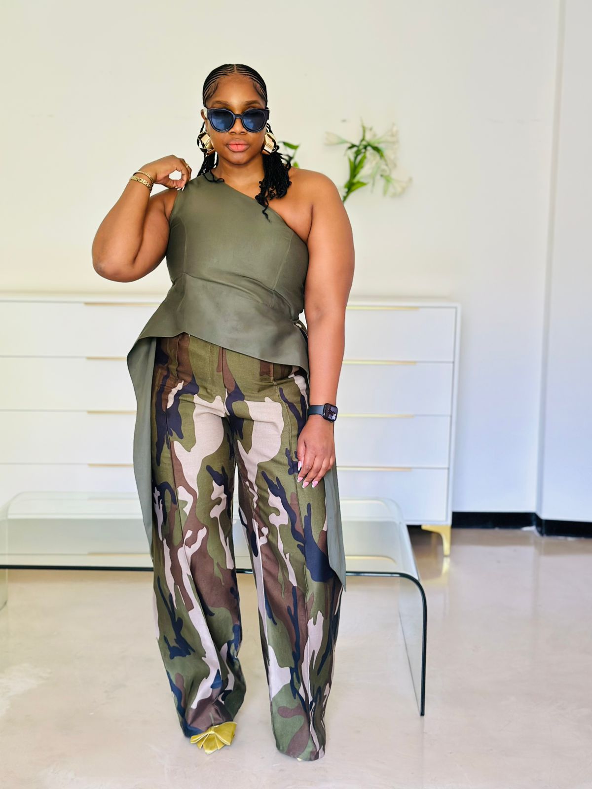 Camouflage wide leg pants & Olive green topCamouflage wide leg pants & Olive green top