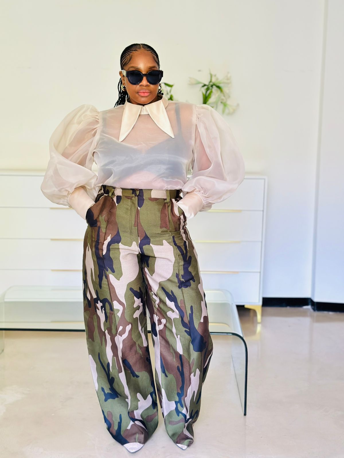 Camouflage wide leg pants & Transparent Nude Top