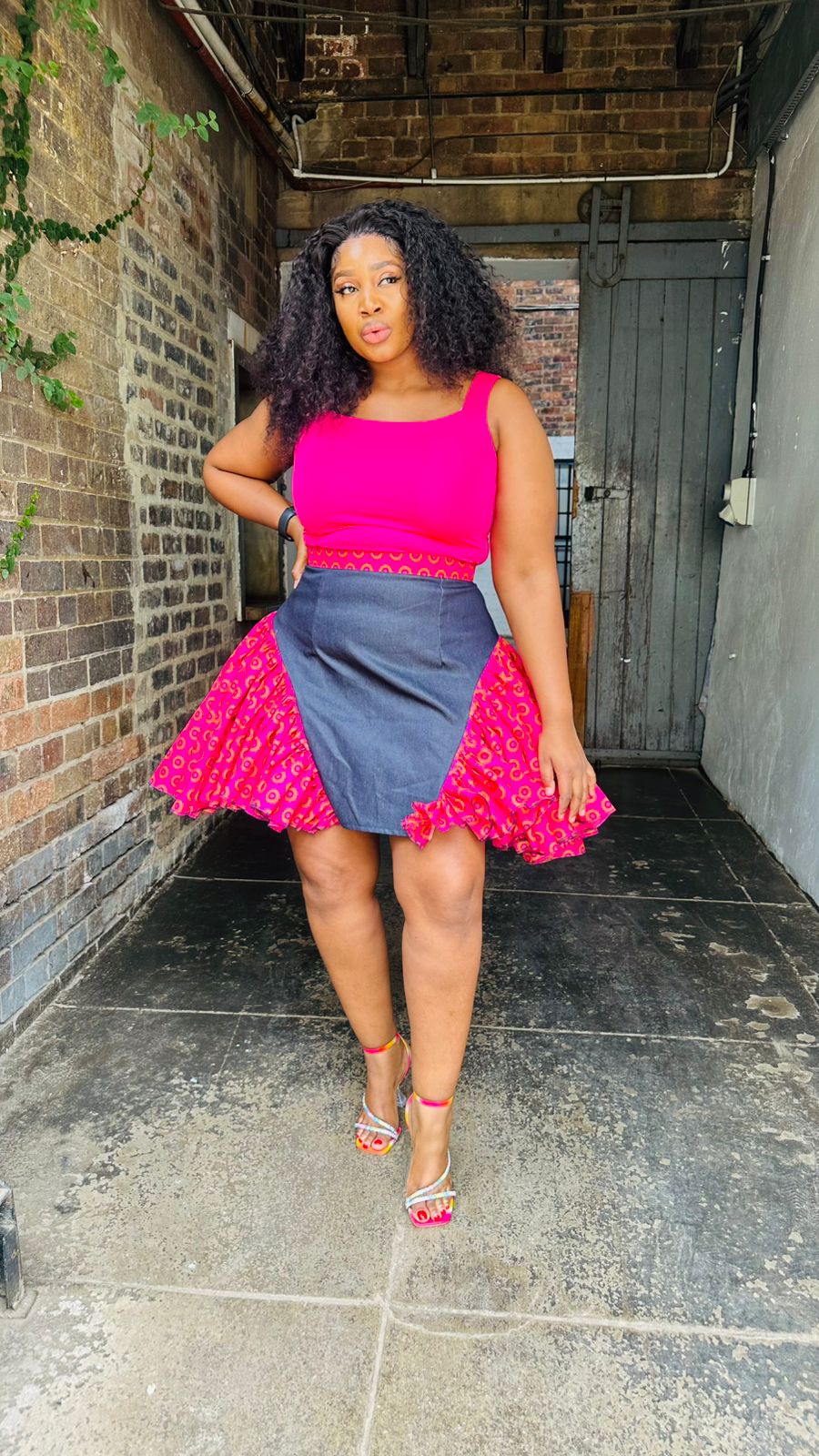 skirt designed with a sleek charcoal center panel and dramatic flared sides in a matching pink patterned fabric, the silhouette is both flattering and dynamic