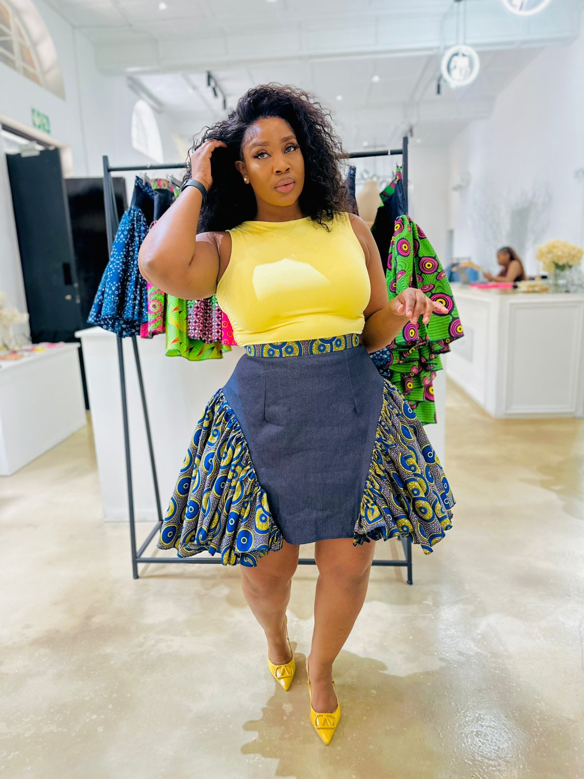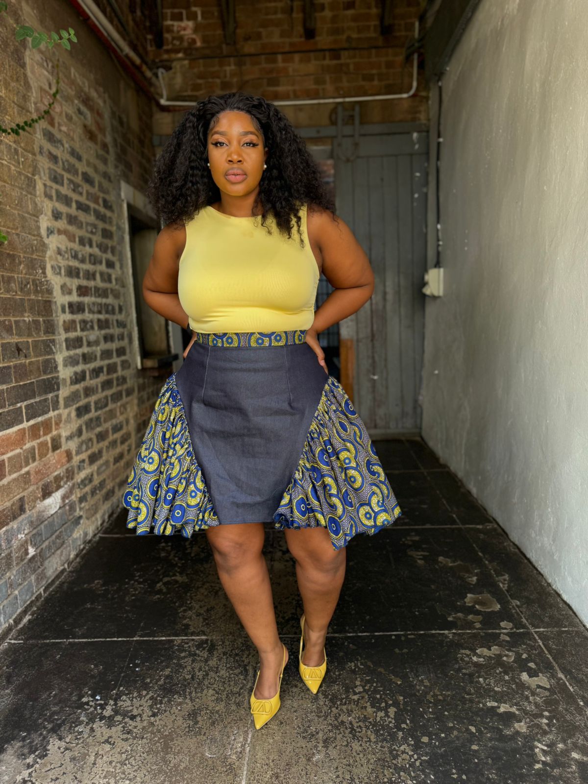 The skirt features a deep charcoal front panel contrasted with bold blue and yellow African-inspired patterned flare side pleats, adding volume, movement, and cultural elegance.
